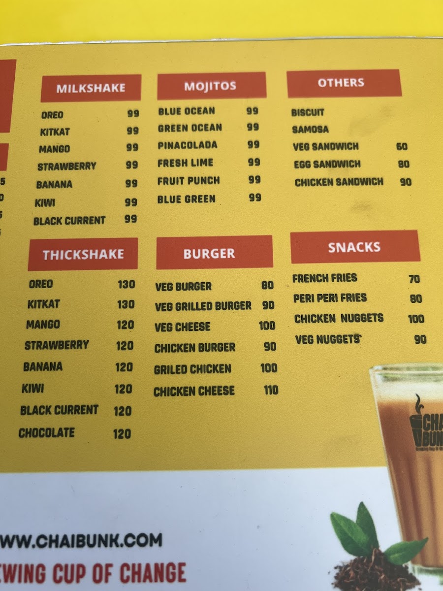 Welcome to Chai Bunk Cafe, a vibrant haven nestled in Rama Krishna Nagar, Kadapa. This newly opened cafe, just by Jeet Punjabi Family Dhaba, offers an extensive menu designed to please every palate. If you're a tea lover, indulge in their delightful range of Chai, including Kadak Chai and the special Kesar Elachi Chai, both priced at just ₹25. For those craving something cool, their Mojitos and thickshakes elevate the experience, creating the perfect refreshment.